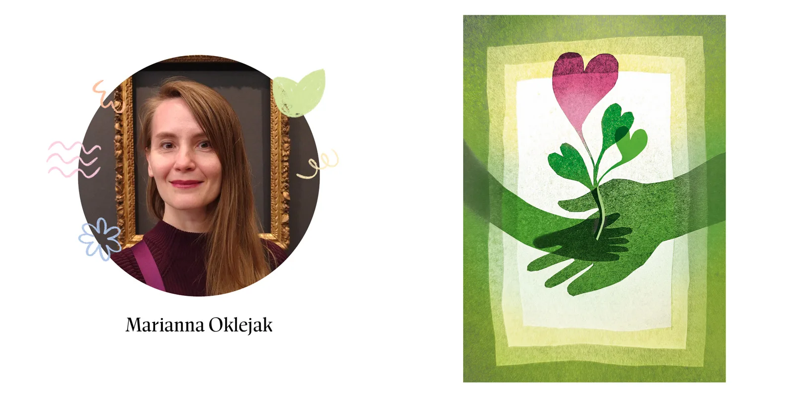 “I decided to explore the theme of relationships. I don’t have children yet, so this was the most personal aspect for me. In my illustration, I focused on how partners support one another. I depicted two people watering each other and surrounded by lush plant life. With support, we can grow together and create something new.”