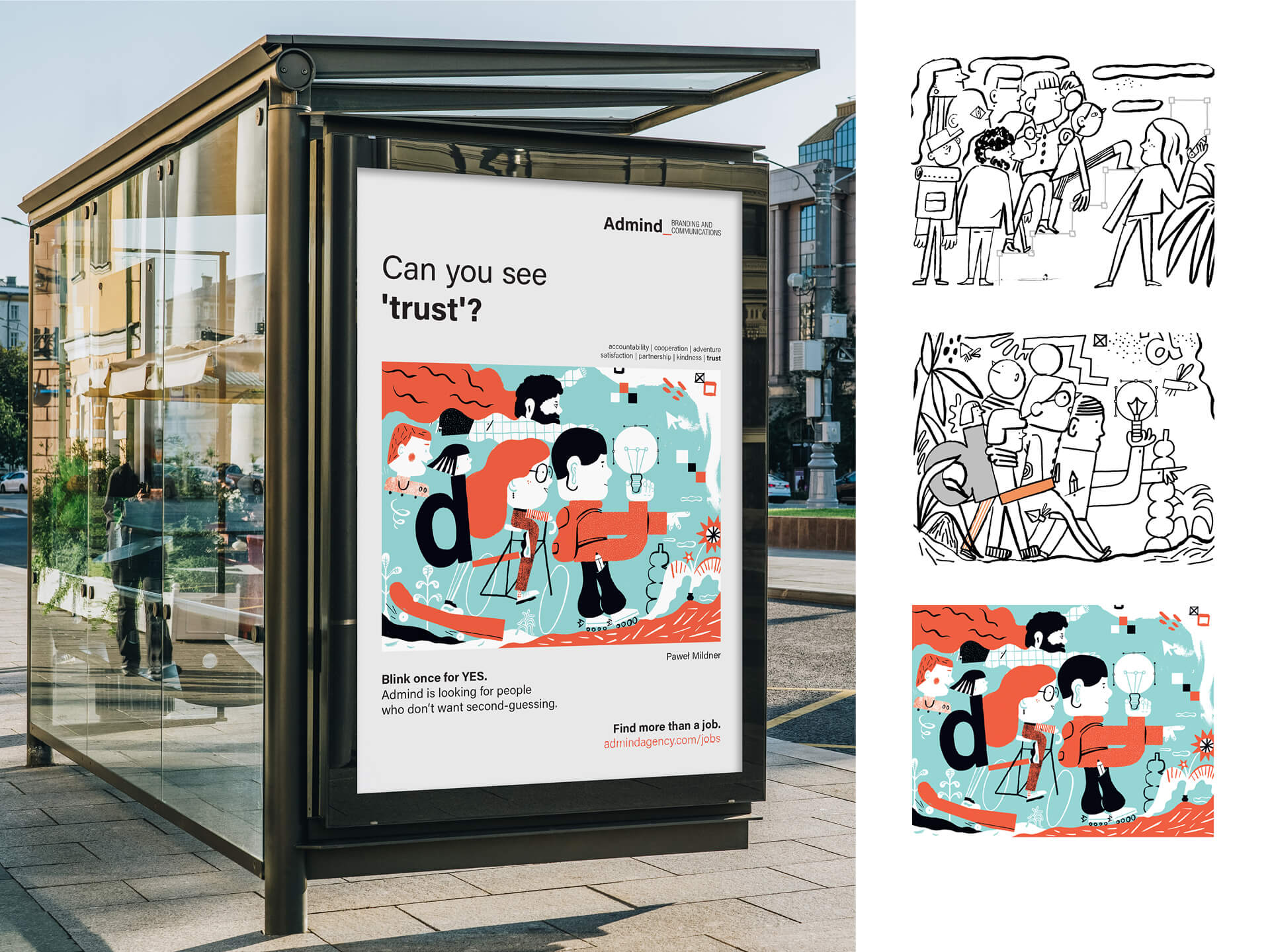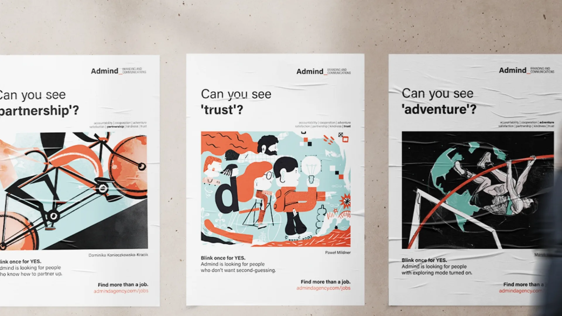 We asked renowned Polish illustrators and our in-house designers to create a range of graphics and posters that highlighted Admind’s core values: trust, cooperation, responsibility, adventure, satisfaction, and kindness. All artists were free to interpret our values and show them in their own distinctive visual style.