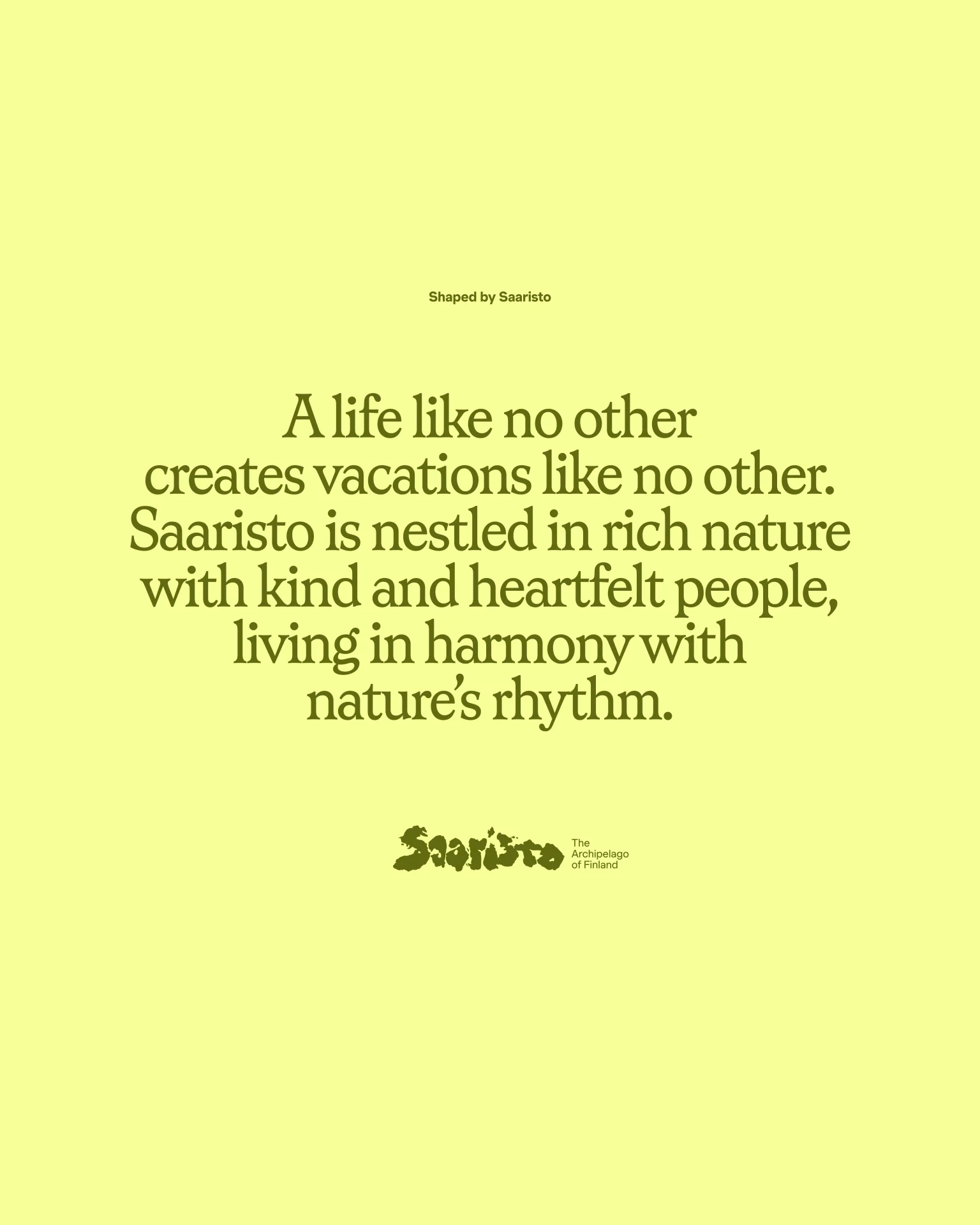 All brand elements are now complete, including the visual identity, website, video materials, and various tools to introduce Saaristo to audiences in Europe and the United States. The brand rollout is already in progress, ensuring its full presence across the islands by summer.